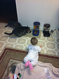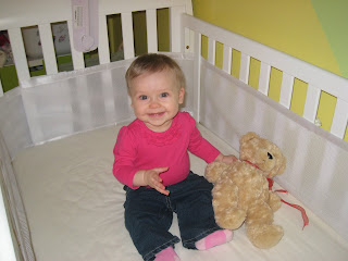 Our big girl is almost ready to walk. In fact she walks all around just holding onto one of my fingers. As soon as she gains enough confidence, she'll take off and there will be no stopping. I think that switching to the new level at the Gymboree class for children between 10 and 16 months is encouraging her to want to start walking, since most of the toddlers in the class are running around on their own.